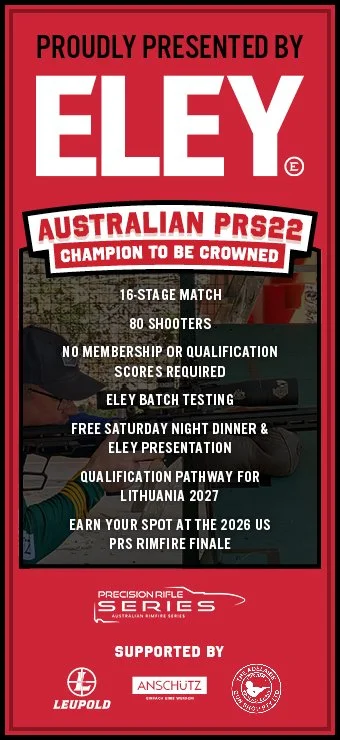 The ELEY PRS22 Australian Championships will be recognized as a key qualification pathway for the 2027 IPRF Rimfire World Championships in Lithuania. Please reach out to AU-PRA for more details.In addition, the Championships will also be used to select 5 shooters to head across to the 2026 USA PRS Rimfire Finale at K&M Precision Rifle Training, Presented by Ruger, October 16-18 2026.